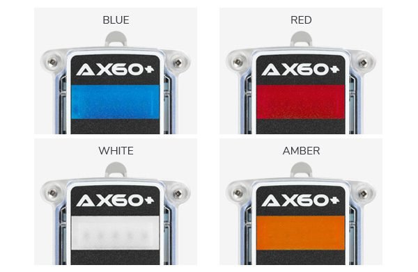 Each alarm unit includes a strobe LED above 100 cd output, and a sounder of at least 80 dBA at 3 meters. The alarm units connect to the sensor via the AX60+ network. You can choose from multiple color filters — in this case, the Blue version — to match visual coding or environment design.