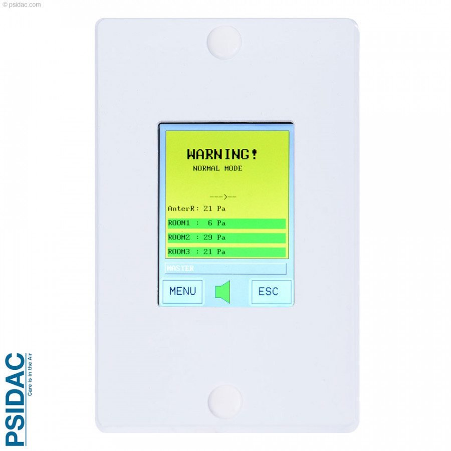 The PSIDAC CPS 6021 is a flexible master control panel designed for demanding environments like hospitals, laboratories, cleanrooms, and pharmaceutical facilities. It can monitor two rooms simultaneously, switching between positive-pressure or negative-pressure modes as needed. The panel supports up to 4 units (slaves) per room, enabling local display of selected parameters in adjacent areas. It communicates via Modbus RS-485 internally, and externally to a BMS or SCADA system. Users benefit from real-time status feedback (green = normal, yellow = warning, red = alarm) and the ability to log, alarm, and relay system events through the building ECM. The CPS 6021 supports a broad range of attached sensors — for gases (CO₂, O₂, etc.), flow, humidity, temperature, and particles — making it a central hub for environmental safety and control. Its modular design allows future expansion (e.g. additional slave panels) with minimal cost and wiring complexity.